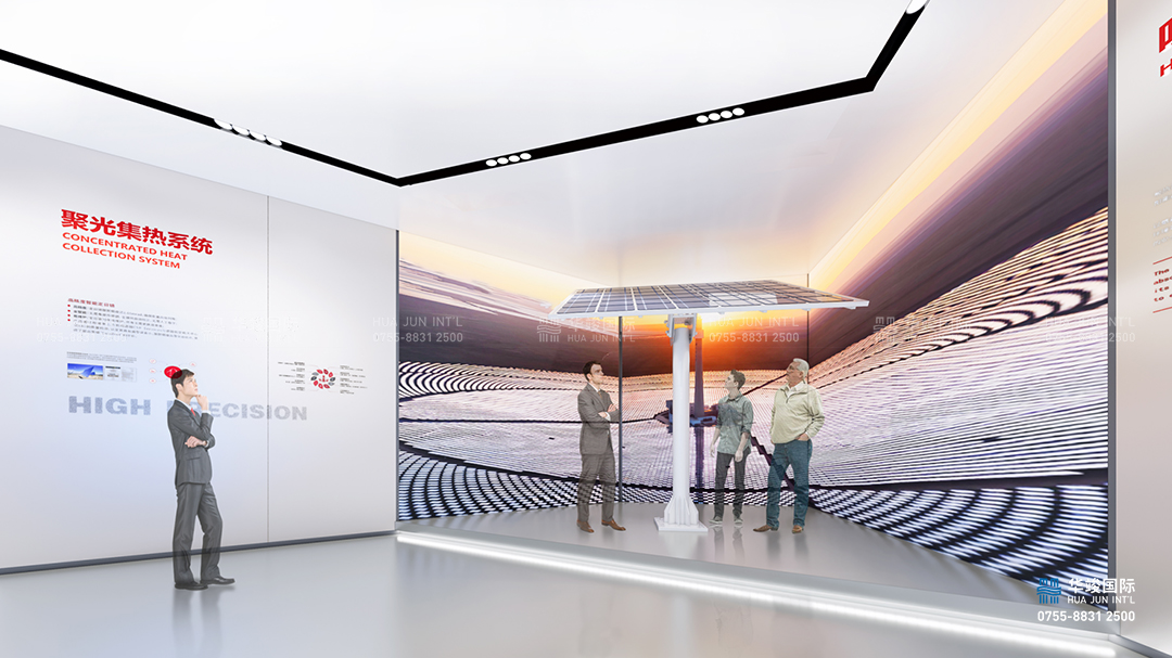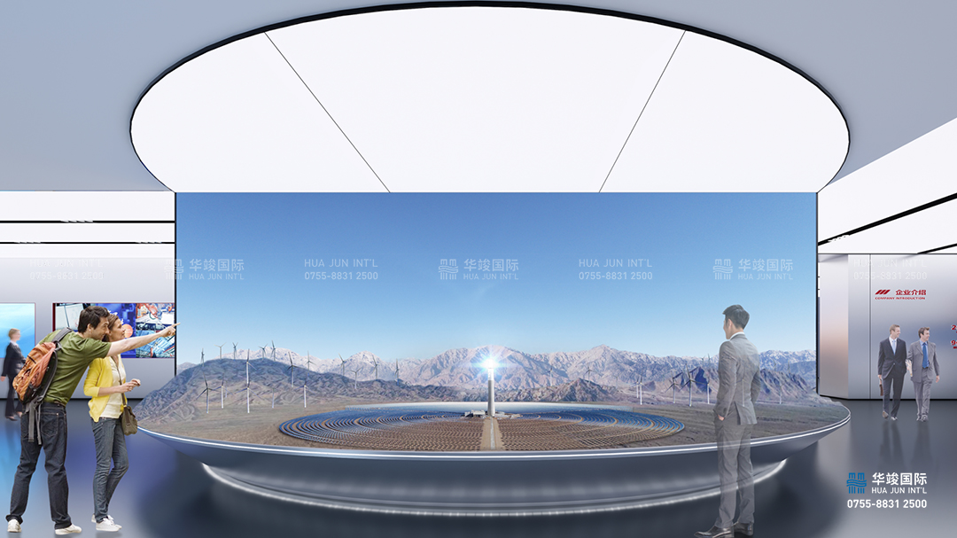 在蒼茫的戈壁灘上一朵盛開的“太陽花”,結(jié)合數(shù)字場景模型,打造沉浸式情景劇場,營造浩瀚廣袤、生機勃勃的空間氛圍,展示從聚光、集熱、儲熱到發(fā)電的全流程塔式光熱發(fā)電核心技術(shù),實現(xiàn)了核心裝備的產(chǎn)業(yè)化、國產(chǎn)化。