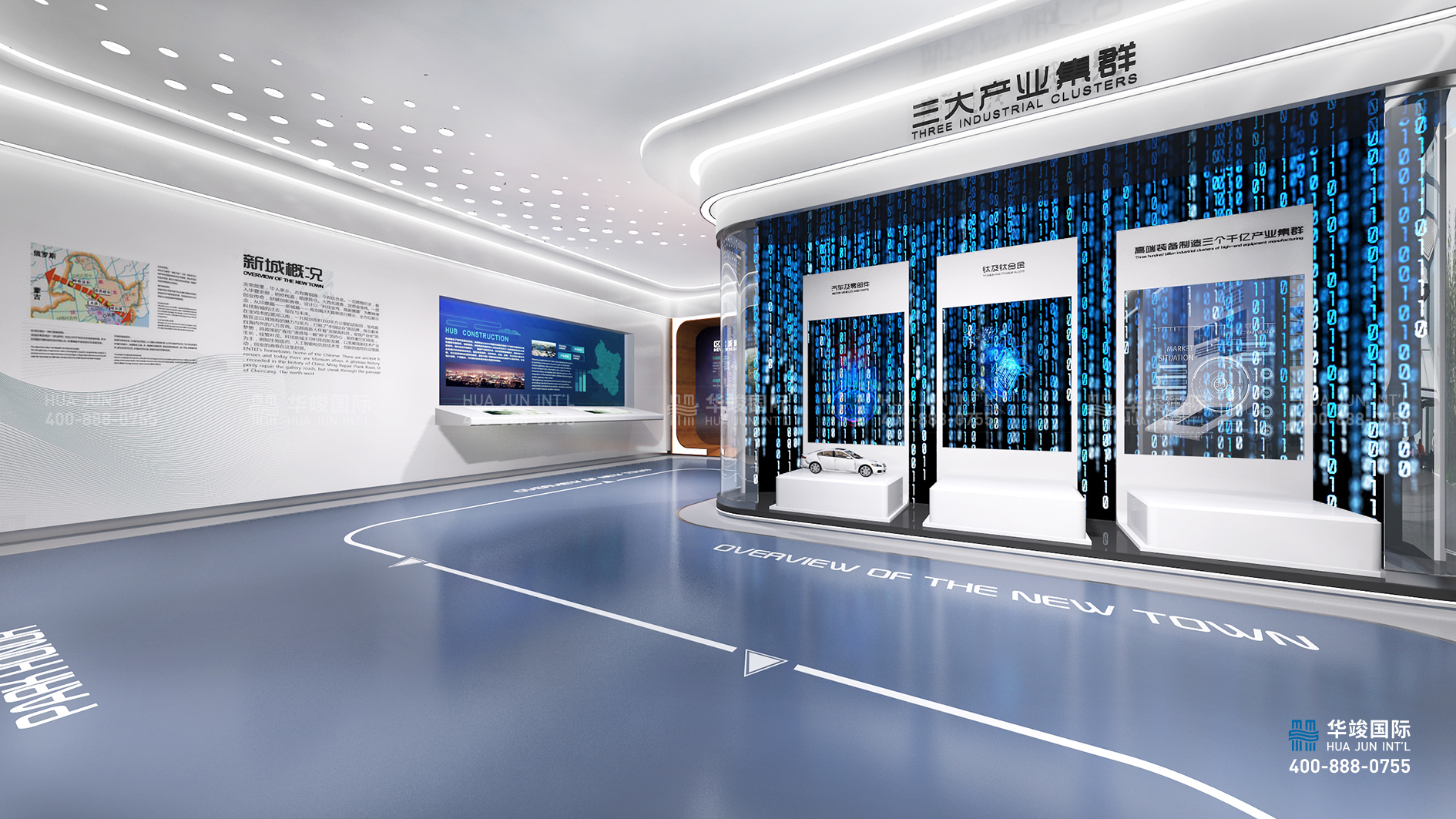 總體規(guī)劃主要內(nèi)容為一心/兩軸/三組 團的總體規(guī)劃布局,利用沉浸式數(shù)字沙盤體驗數(shù)字科技感的空間氛圍,使參觀者身臨其境,切身融入到高新區(qū)科技新城的場景之中。