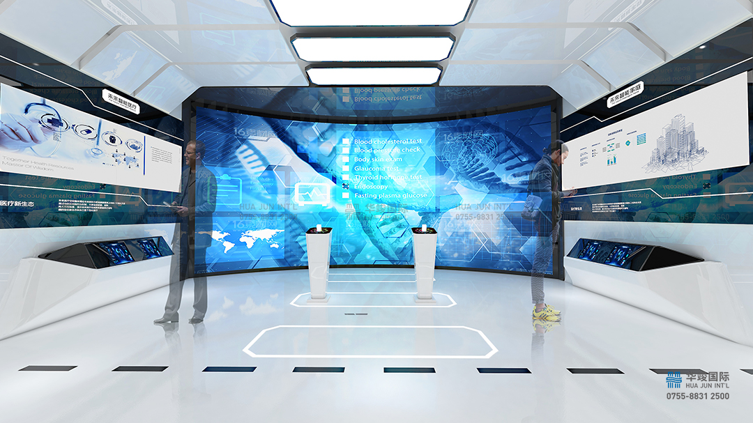 鄭州黃河科技學院智慧醫療體驗廳項目由華竣數創執行整體設計施工,華竣數創擁有頂級展館設計團隊和國際化的創新設計理念,融合互聯網+思維,順應科技化趨勢,打造全新智慧多媒體展廳。