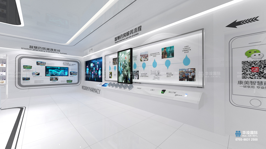 寶安康美智慧醫(yī)藥展館設(shè)計項目由華竣國際執(zhí)行整體設(shè)計施工,華竣數(shù)創(chuàng)擁有頂級展館設(shè)計團隊和國際化的創(chuàng)新設(shè)計理念,融合互聯(lián)網(wǎng)+思維,順應(yīng)科技化趨勢,打造全新智慧多媒體展廳。