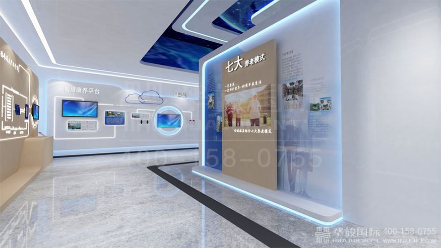 在行業(yè)布局戰(zhàn)略規(guī)劃展示區(qū)域,華竣國際為整體空間由上至下營造了大氣磅礴的恢宏氣勢。通過數(shù)字互動沙盤結(jié)合LED屏幕,展示了企業(yè)如何推動老年事業(yè)的發(fā)展及其行業(yè)先鋒的勢頭。